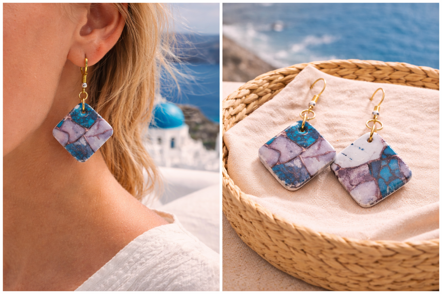Like moonlight over the Aegean, these diamond-shaped earrings swirl with soft blues, blush tones, and glimmers of gold. Romantic, artsy, and made for late-night wandering through cobblestone streets.