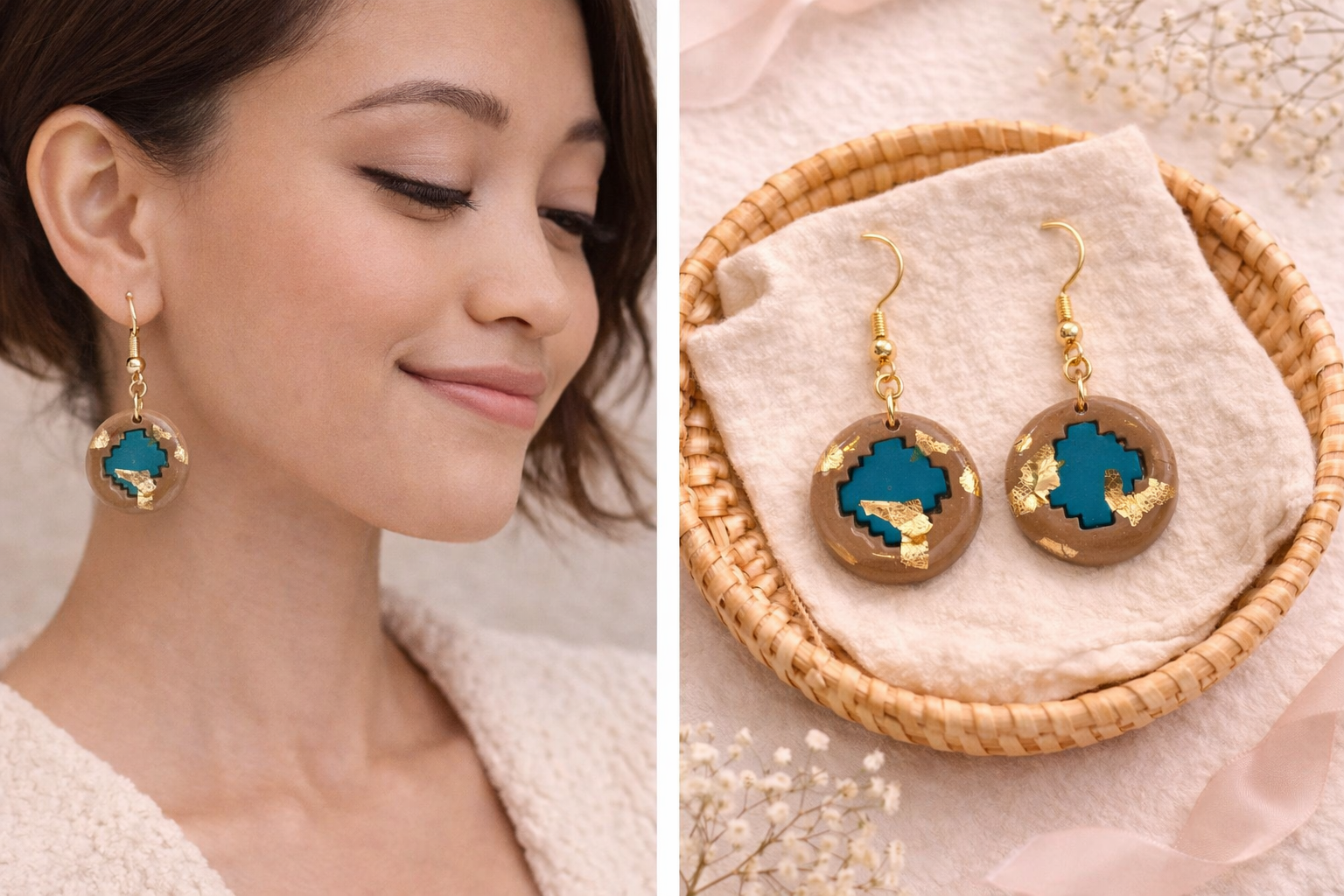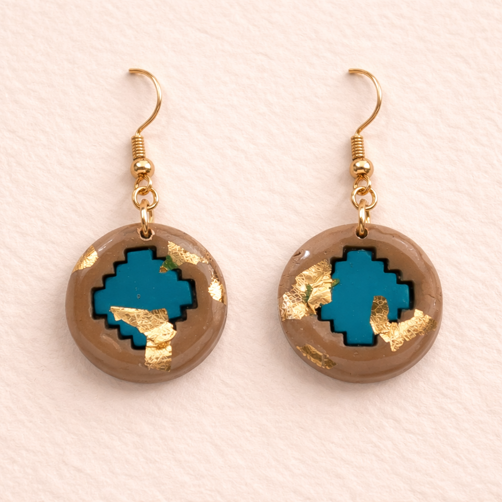 Turquoise hearts wrapped in warm neutrals with flickers of gold. These earrings feel like a road trip romance, bold, free-spirited, and just a little magical.