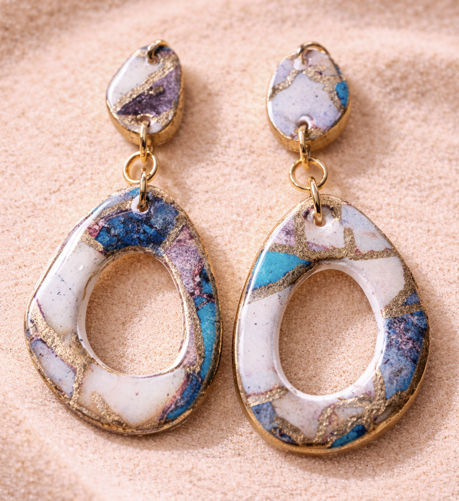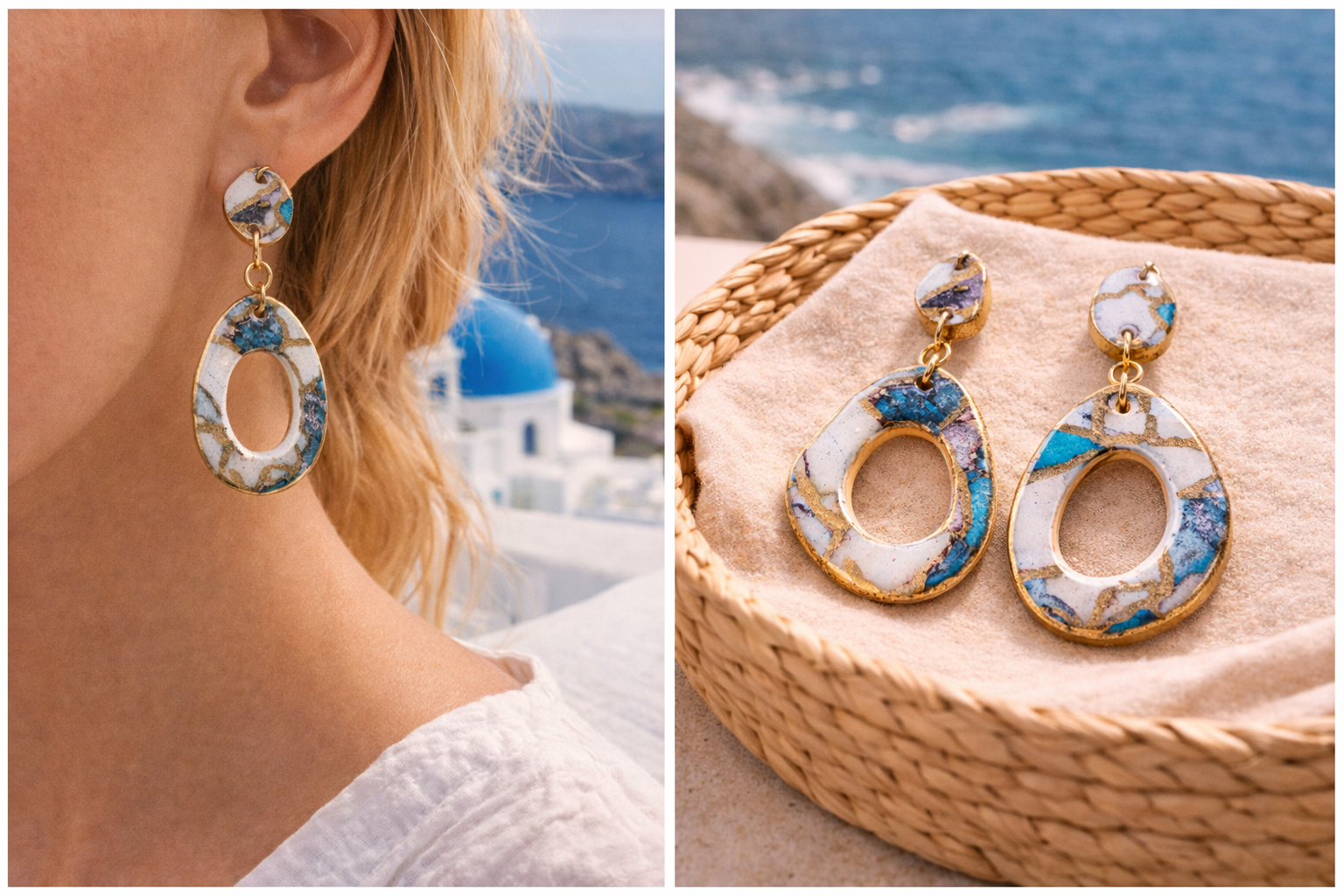 Open oval halos wrapped in marble blues and flecks of gold glow like the sun setting over Oia. These earrings are bold, flirty, and absolutely unforgettable, just like the island itself.