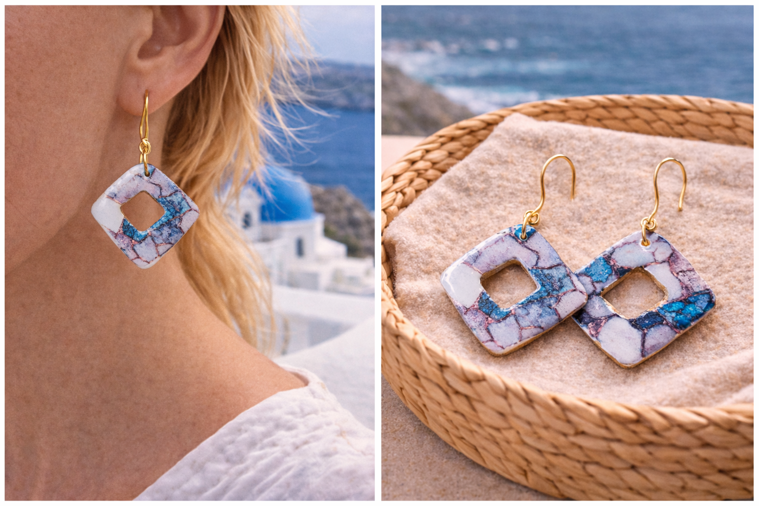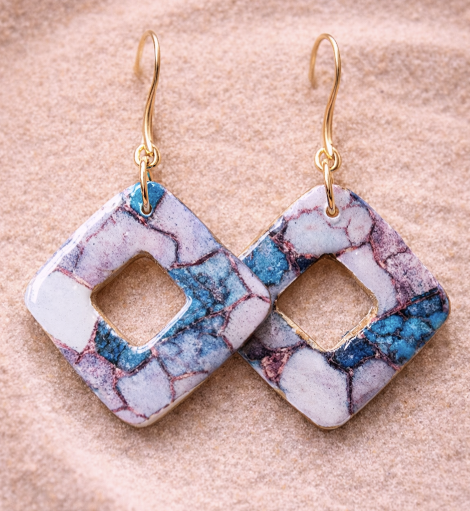 Open diamond silhouettes swirl with dreamy blues, blush marble, and fine gold veining. Light, flirty, and full of movement, these earrings feel like sunset flirting in a whitewashed courtyard.