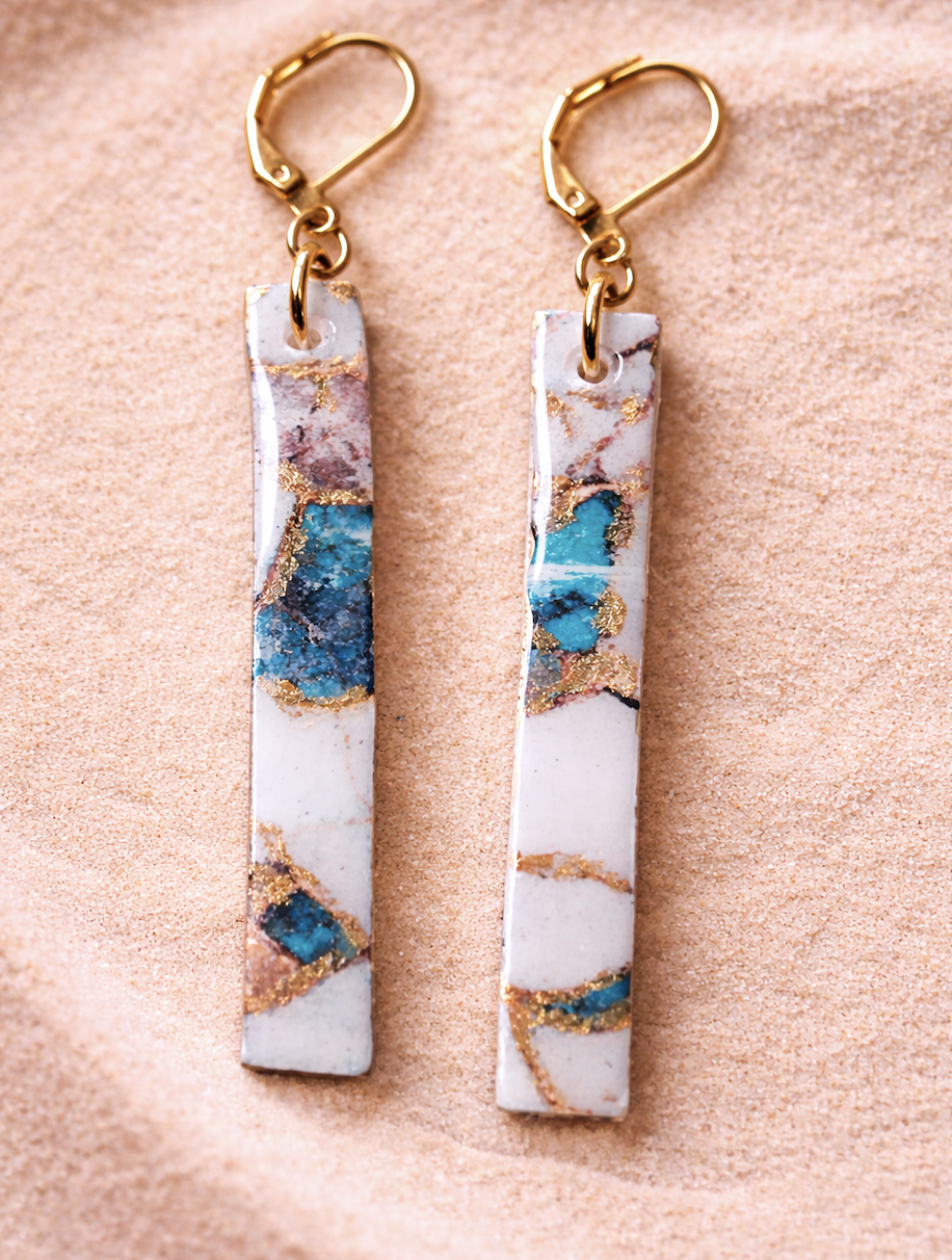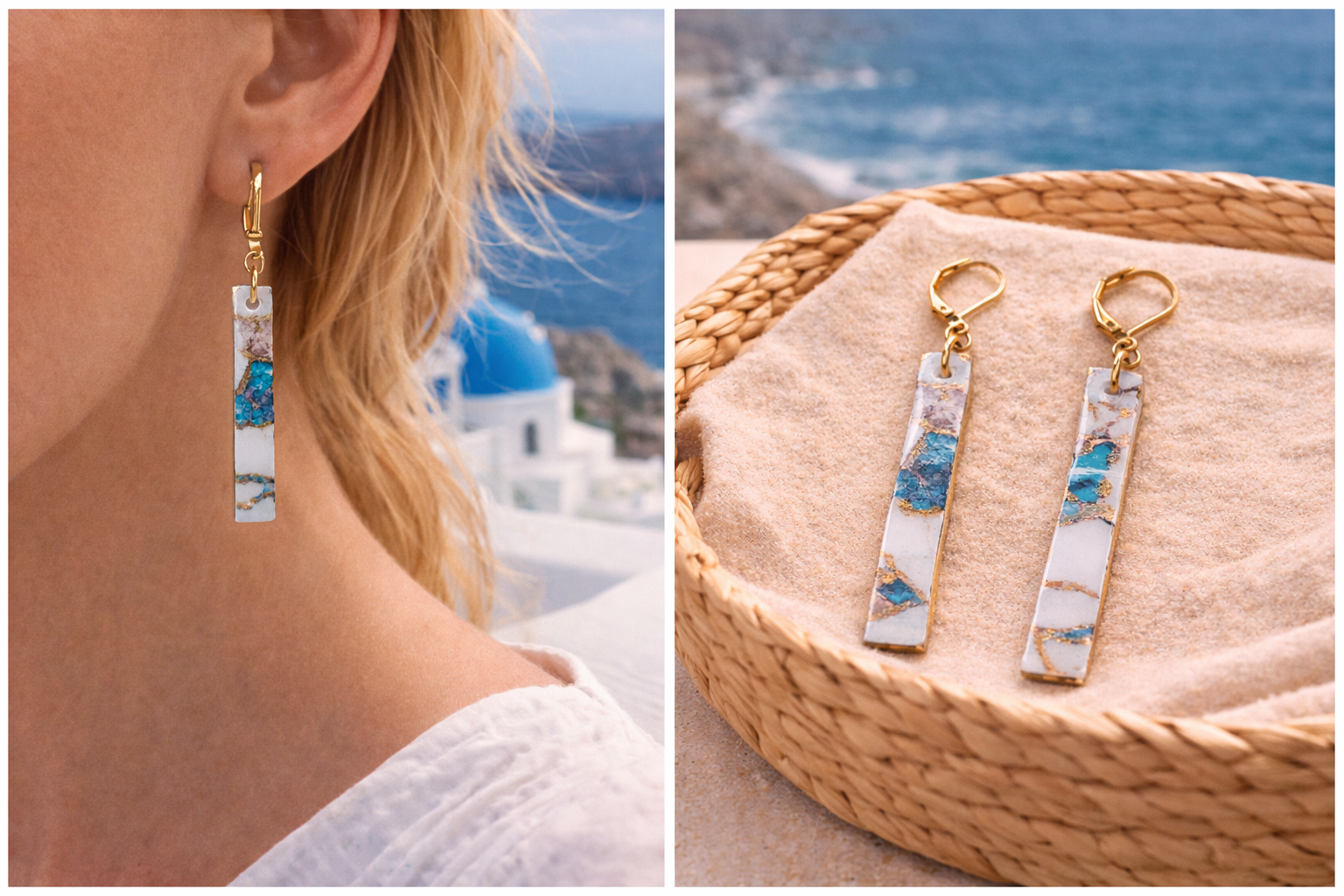 Long marble columns streaked with turquoise and molten gold create a sleek, sultry silhouette. These earrings sway with every step, perfect for rooftop dinners and dancing under the stars.