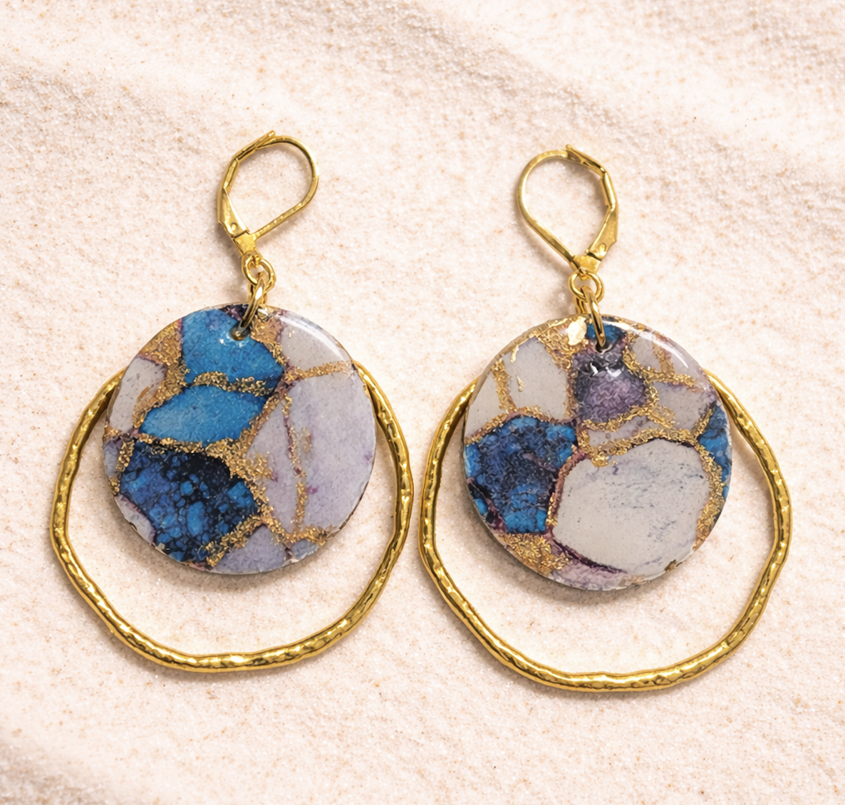 The Santorini Sunset is inspired by romantic evenings overlooking the Aegean, where time slows and every moment feels sun-kissed. Soft blues and creamy neutrals mingle with delicate gold veining, echoing island pathways, sea glass, and glowing sunsets. Finished with an organic gold hoop, these earrings feel effortless, dreamy, and made for spontaneous getaways, even if you’re just headed out to dinner.